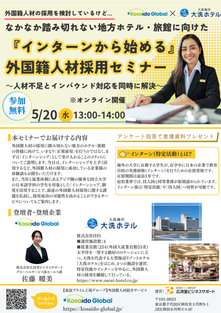 KosaidoGlobalでは、 【外国籍人材の採用を検討しているけど・・・なかなか踏み切れない地方のホテル・旅館に向けた『インターンから始める』外国籍人材活用セミナー~人材不足とインバウンド対応を同時に解決~】 を開催します。